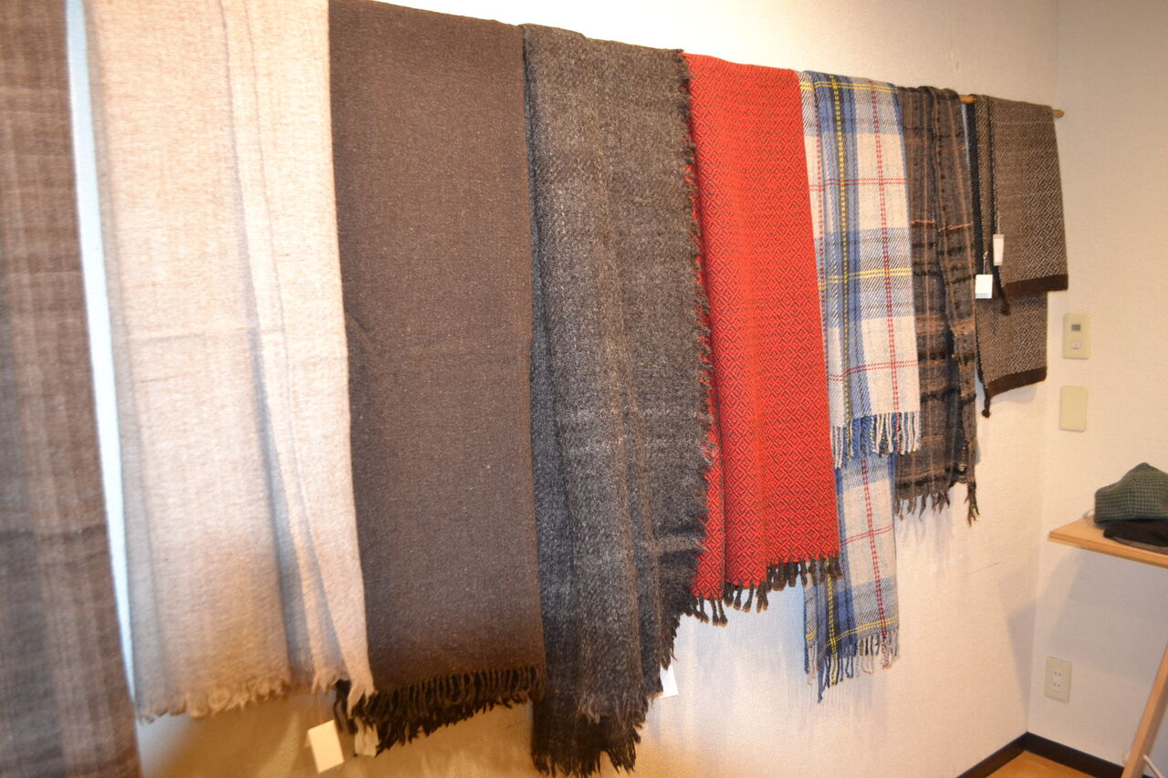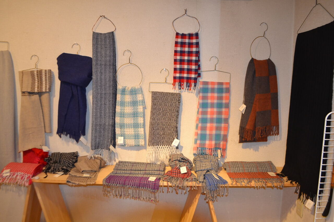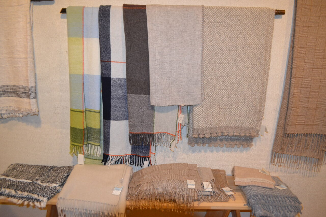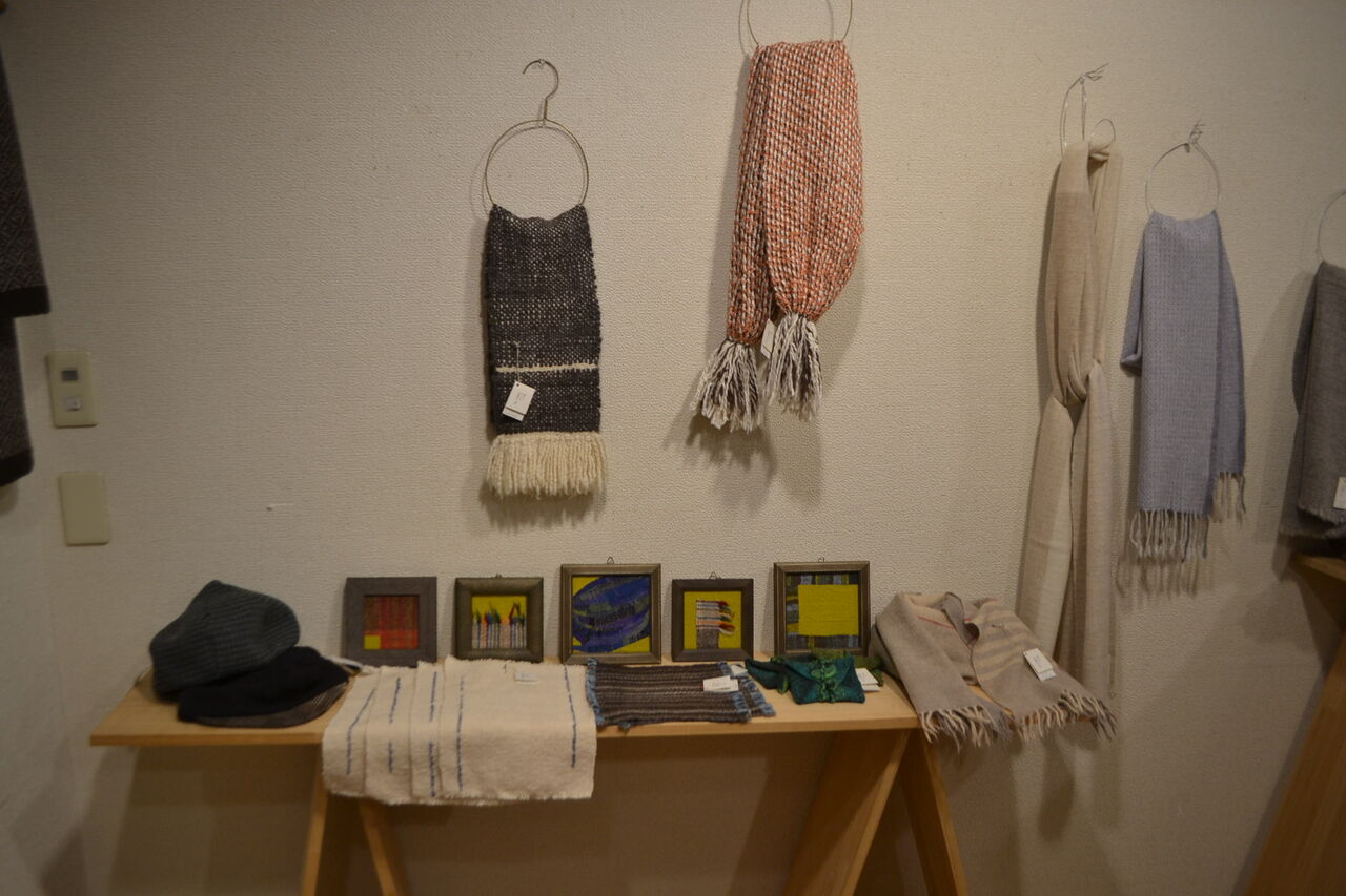 会場いっぱいに素敵でかわいい手織物が展示販売中、ちょうどあったかい服飾品が欲しくなってきた時期ですね、浦田さんのルーツが北海道というご縁もございました。