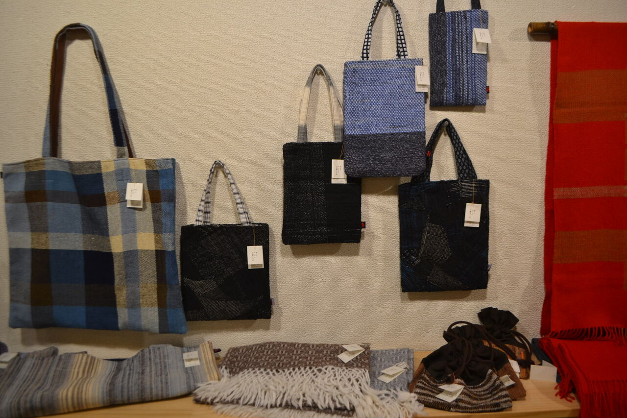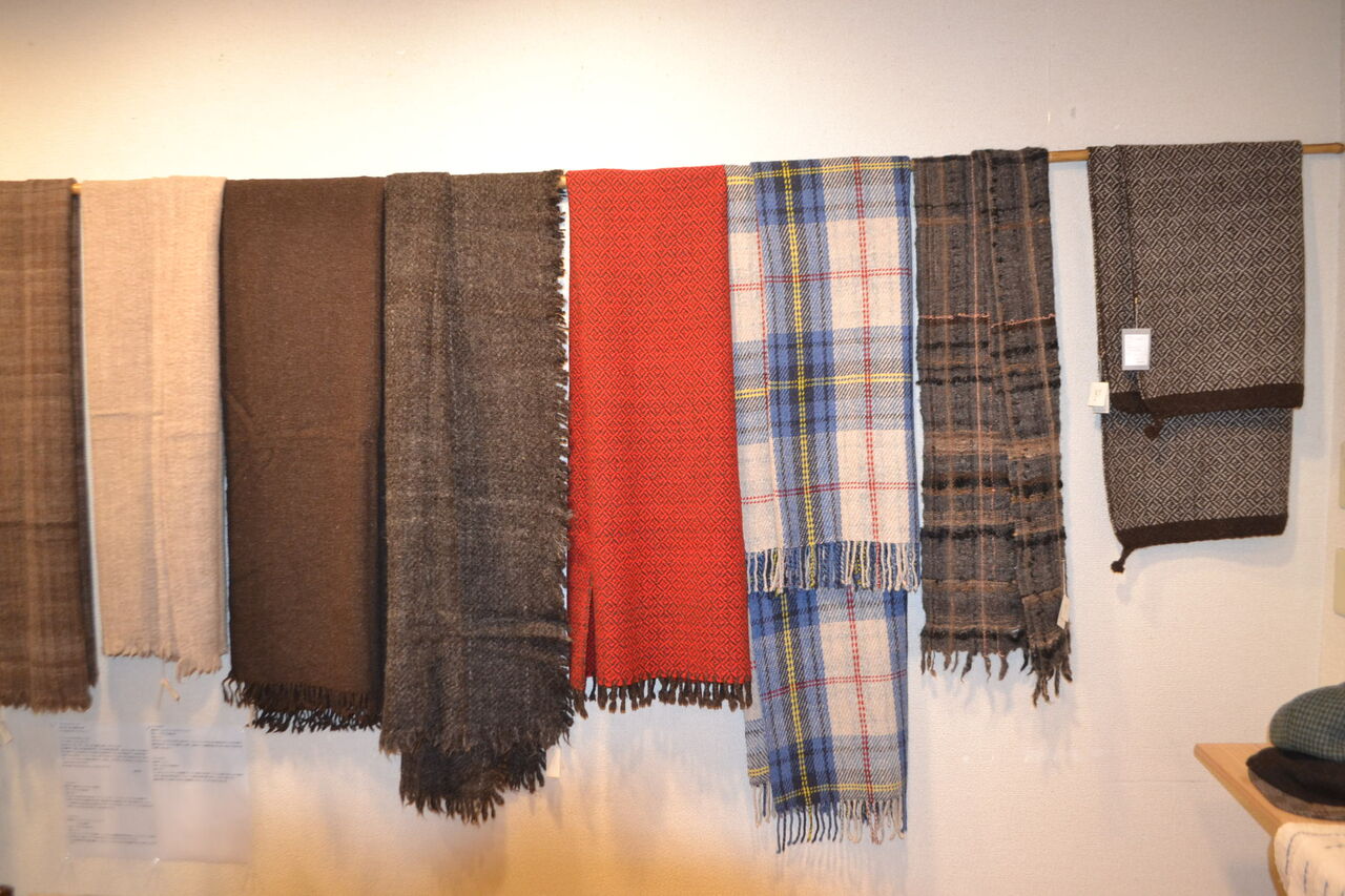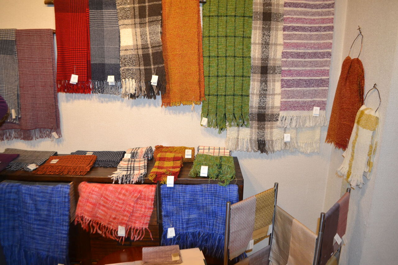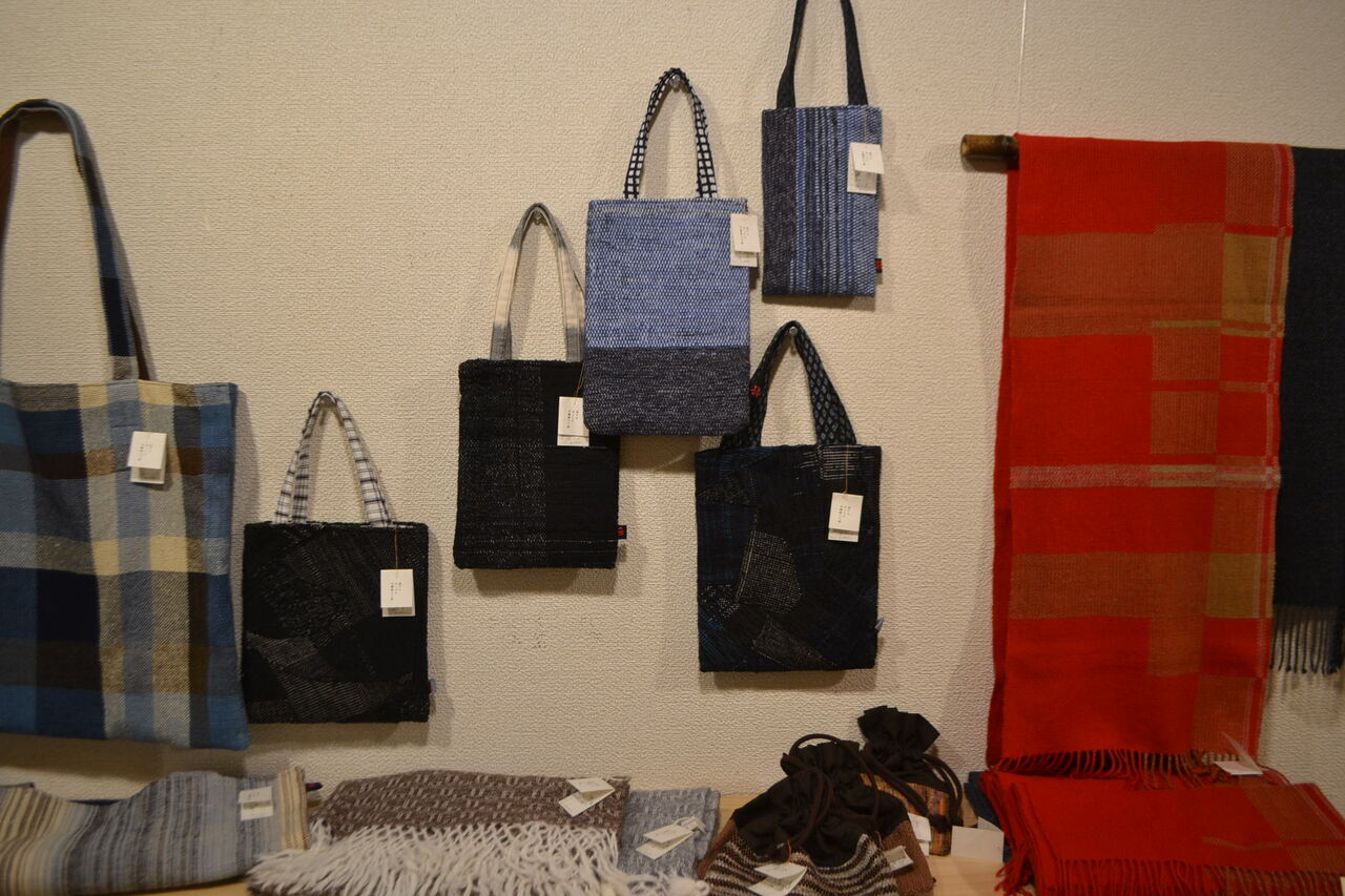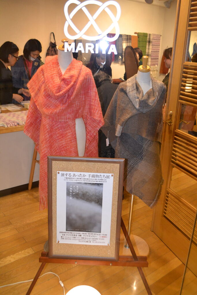 会場いっぱいに素敵でかわいい手織物が展示販売中、ちょうどあったかい服飾品が欲しくなってきた時期ですね、浦田さんのルーツが北海道というご縁もございました。