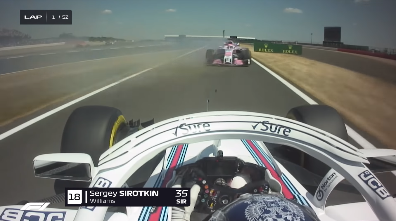 04. ペレスがスピンしてピットスタートのウィリアムズ2台の前に(1周目)