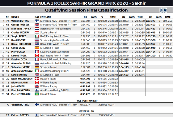 F1サキールGP予選 ヴァルテリ・ボタスPP フェルスタッペン3位 |