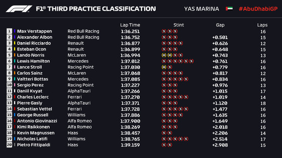 F1アブダビGPフリー走行3回目 1位フェルスタッペン |