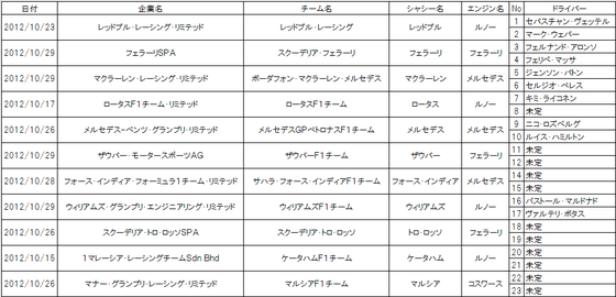 2013年F1参戦リスト HRTは未申請: FIA公式プレスリリース |