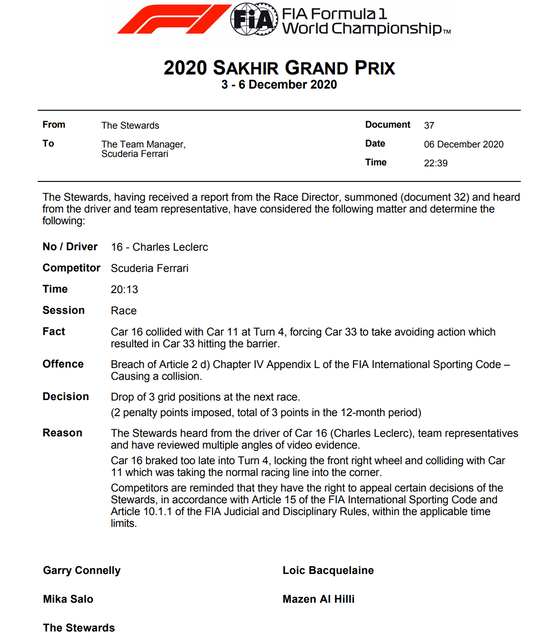 シャルル・ルクレール、次戦グリッド3番降格ペナルティ:F1サキールGP |