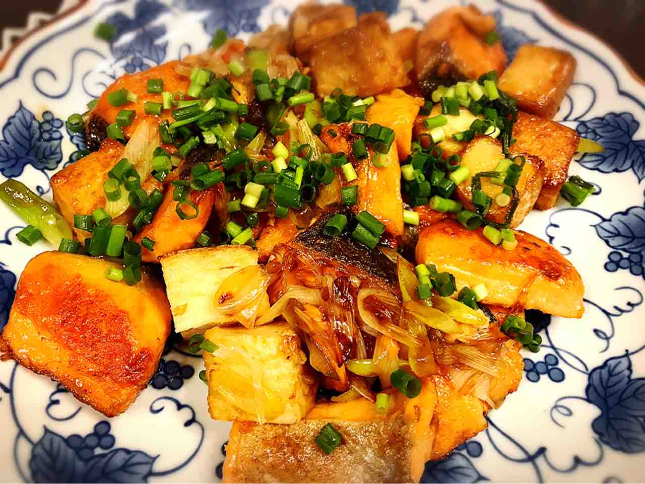 厚揚げとともに焼きます。先に炒めておいたネギと、