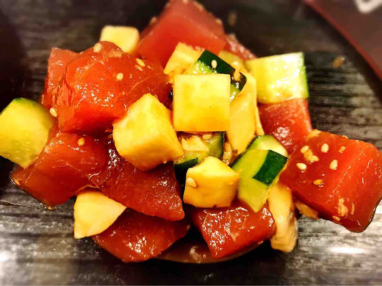 キハダマグロ、キュウリ、長芋を角切りにし、