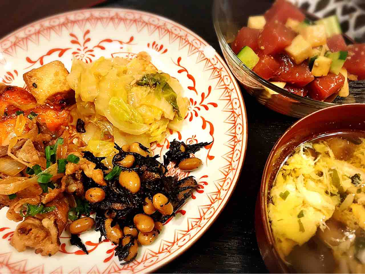 豚とねぎの醤油炒め 鮭と厚揚げの照り焼き ながいもとマグロとキュウリの和え物 白菜の煮物 しめじとワカメのかきたま汁 #gohan