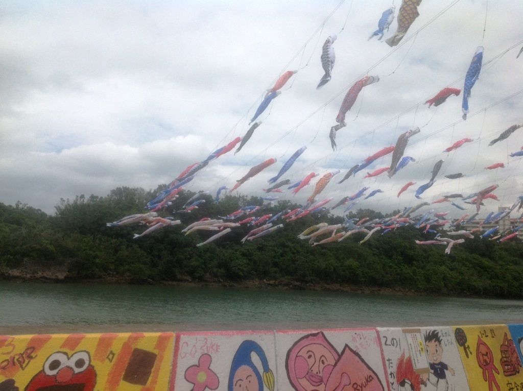 Koinobori flying over the Hija River in Okinawa Prefecture.