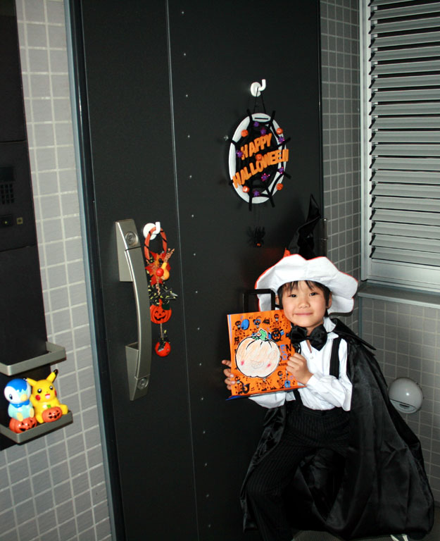 …が、実際には子どもたちには事前にお菓子を入れるための袋を用意させていたために気持ちが先走ってしまい(笑)、部屋に行って「Trick or treat.」と言う前に袋を差し出す子どもが連発。