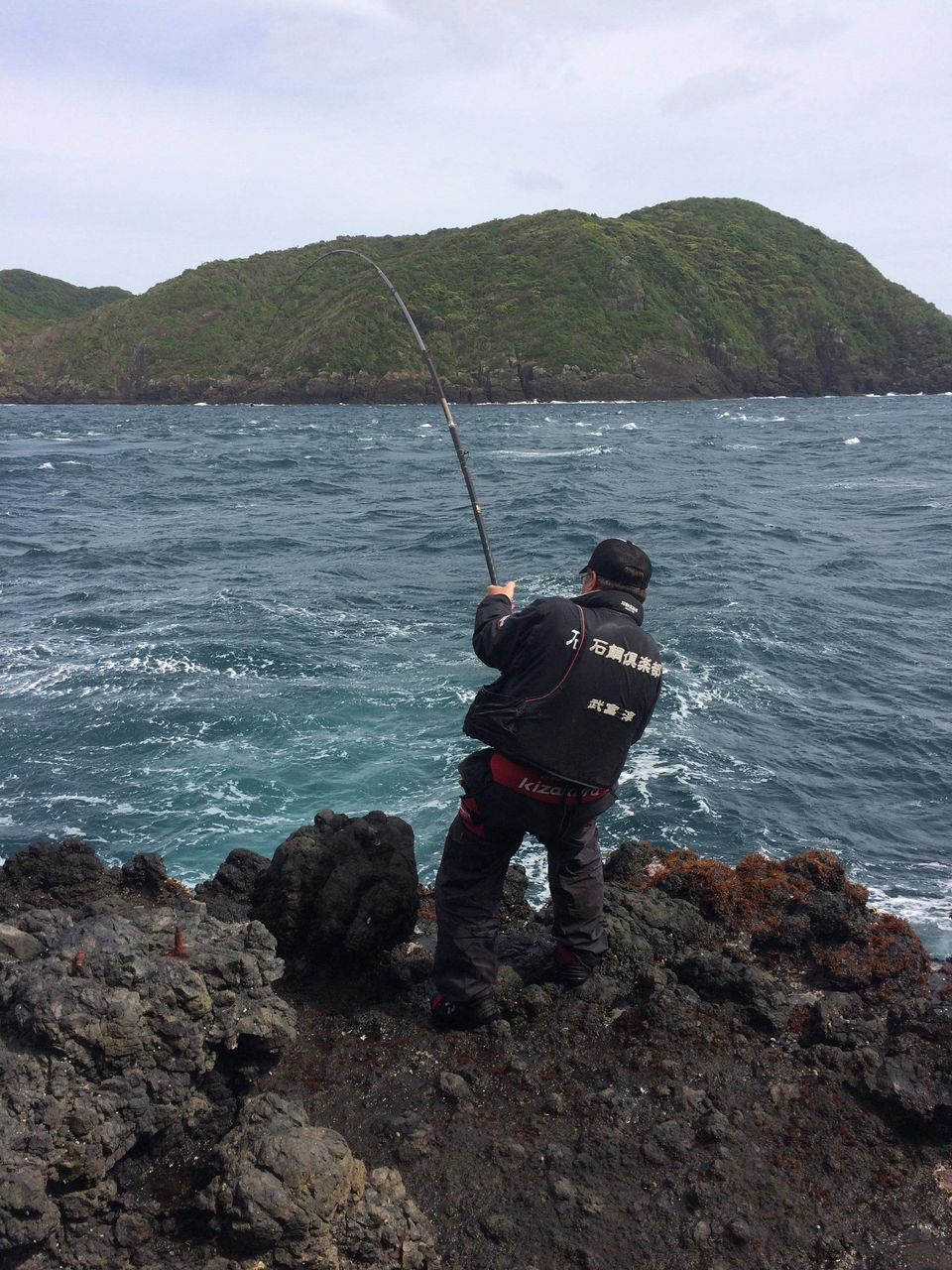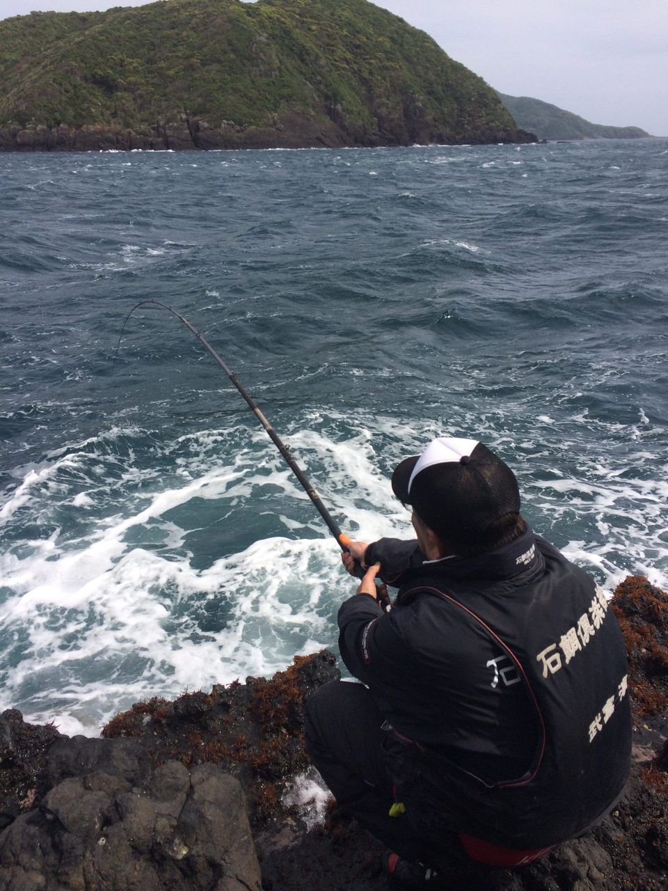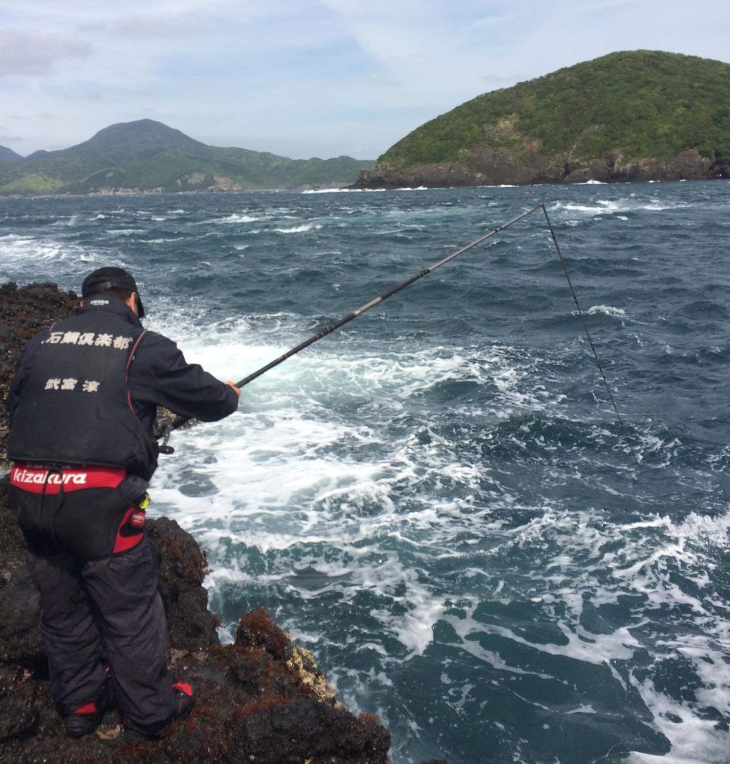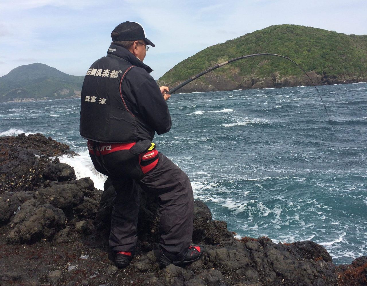 相当な大物のようですが、頼りになる愛竿の粘り腰で徐々に寄せます。ところがここぞとばかりに瀬際で真下へ突進します。足元はそんなに深いのか?必至で耐えますが、力負けして海へきずり込まれそうになります。容赦ない強引に70の文字が頭を横切ります。