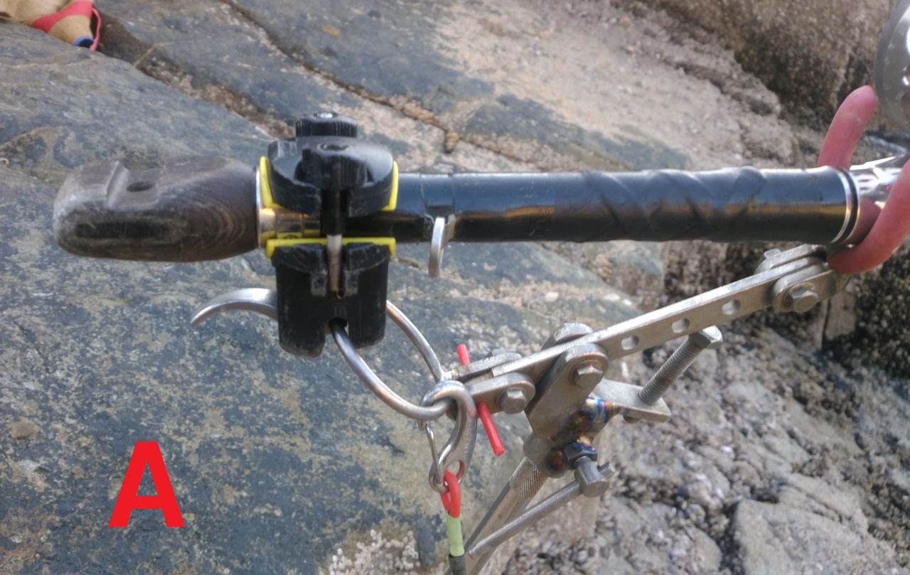 ではなぜ倒れたのか?私は置き竿の場合、写真Aのようにキーパーセットを竿尻に取り付け輪っかに掛けています(本来は輪っかの中に竿尻を入れて使い、輪っかはコンパクトに収納できるように前に倒れます)。通常の使い方をしておらず、これだと竿の重みで輪っかが前に倒れるので、写真Aのように赤い遠投天秤用のパイプを穴に通して倒れないようにロックしています。ところが大アタリの衝撃でパイプが折れて輪っかが倒れたのです(写真B)。釘などの金属を入れていればよかったのに、プラスチックなので耐えきれなかったのです。かなりの負荷が掛ったのでしょうが、それを想定できていなかった私の考えが甘かったのです。