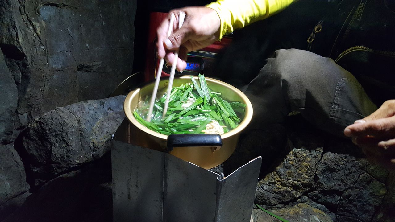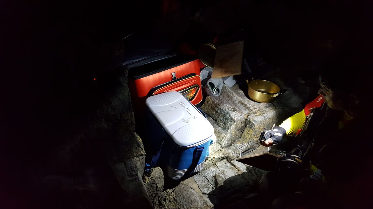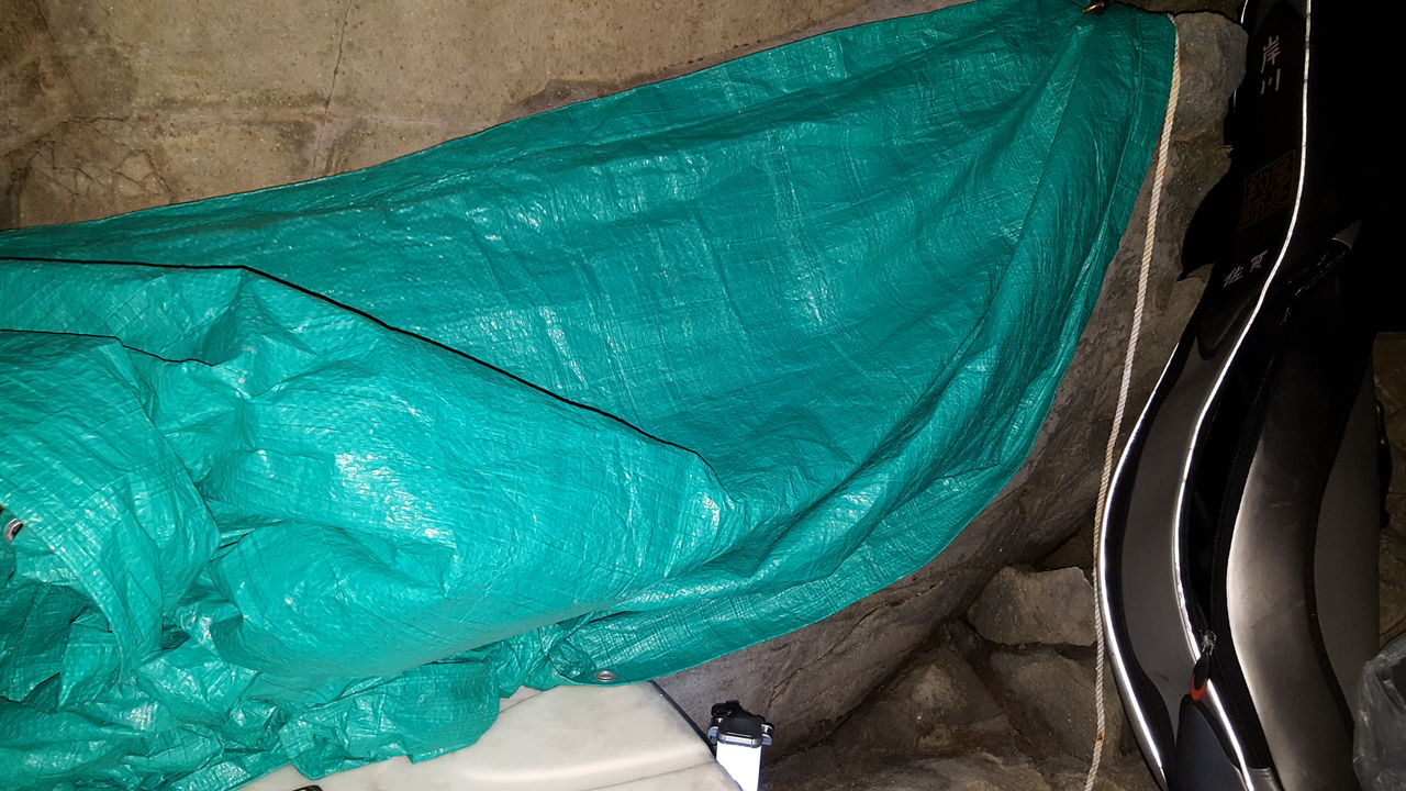 そして夜は雨の予報・・・岩の割れ目にピトンでブルーシートを張り・・・