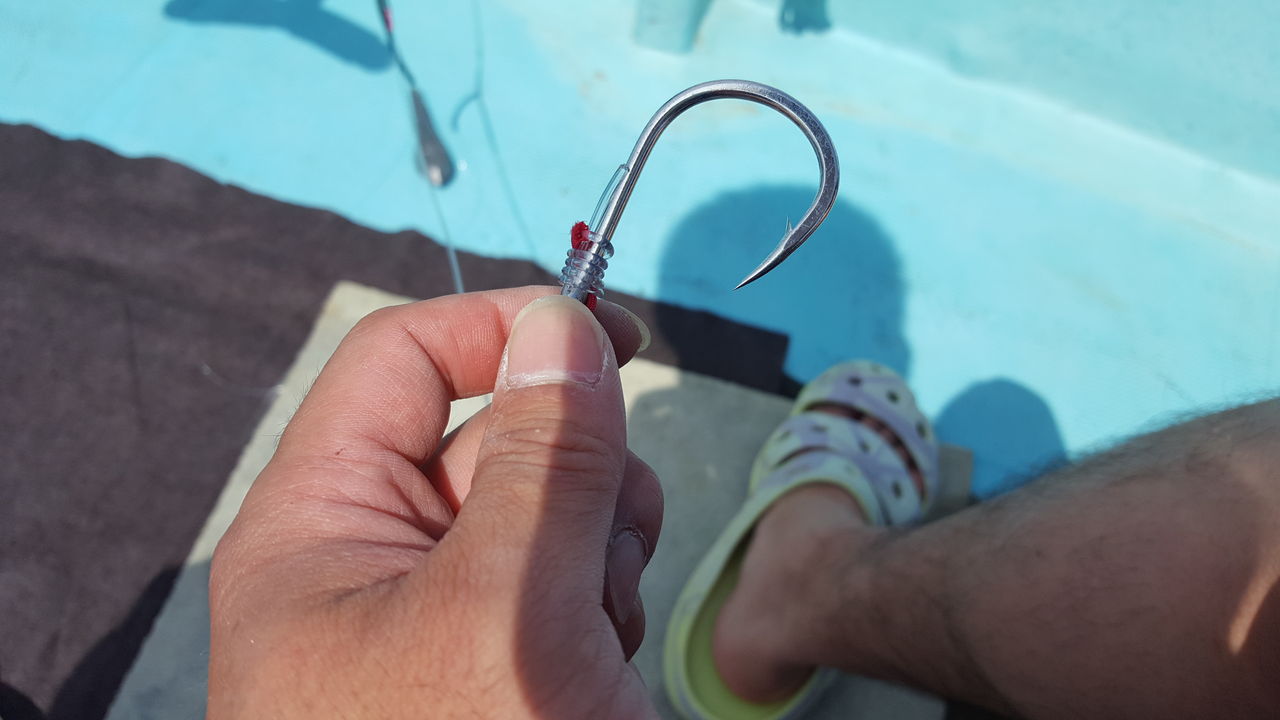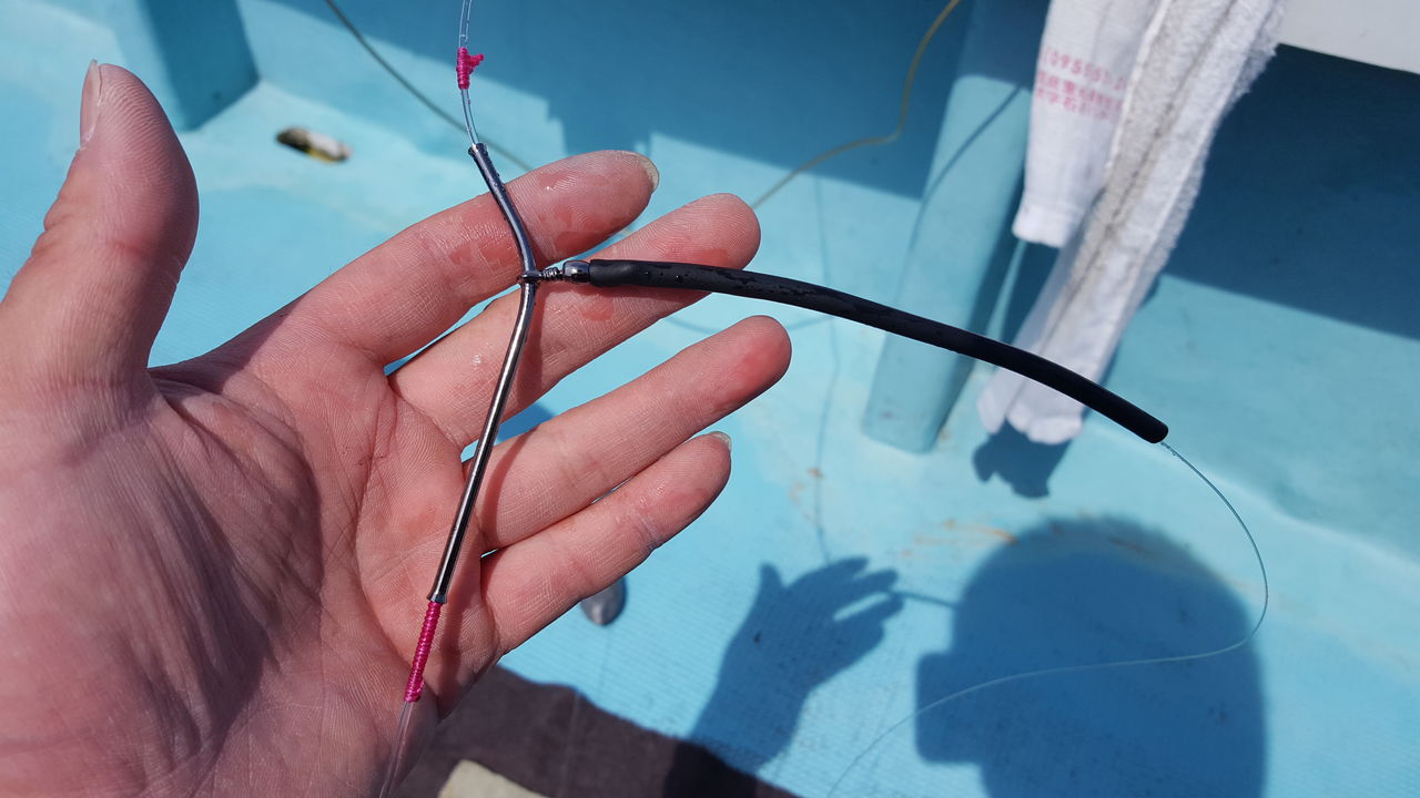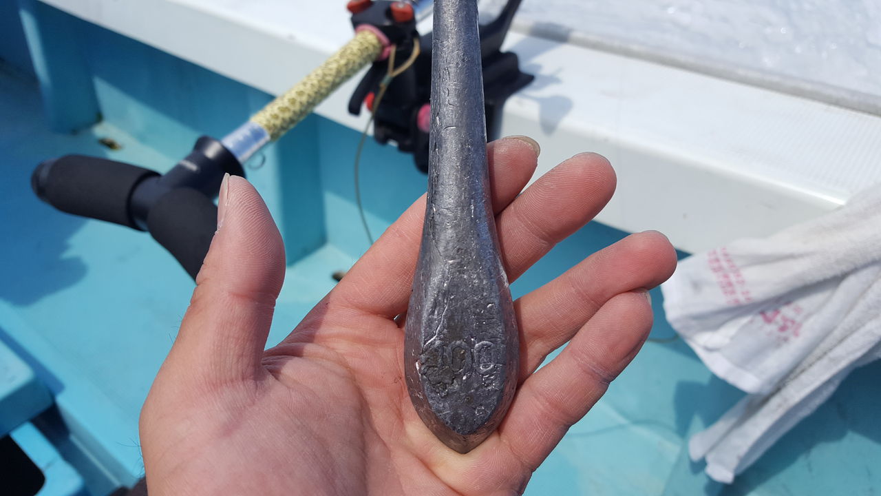 メタルスッテ仕掛けで、75g程のメタル、又は20号のオモリを使用します