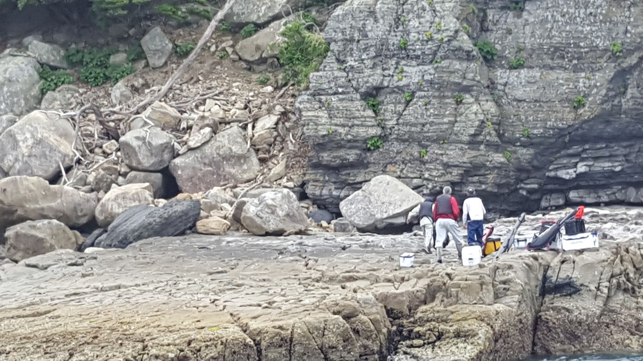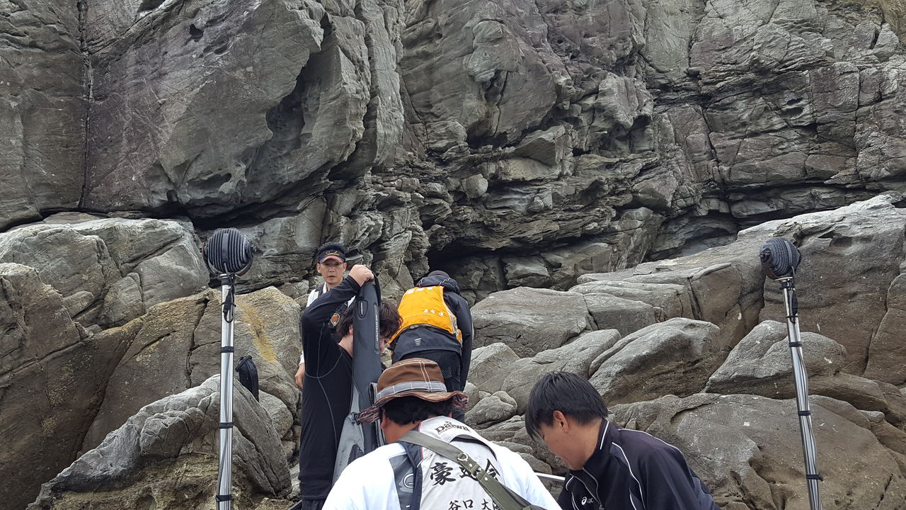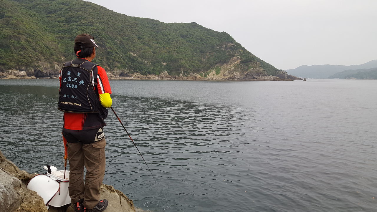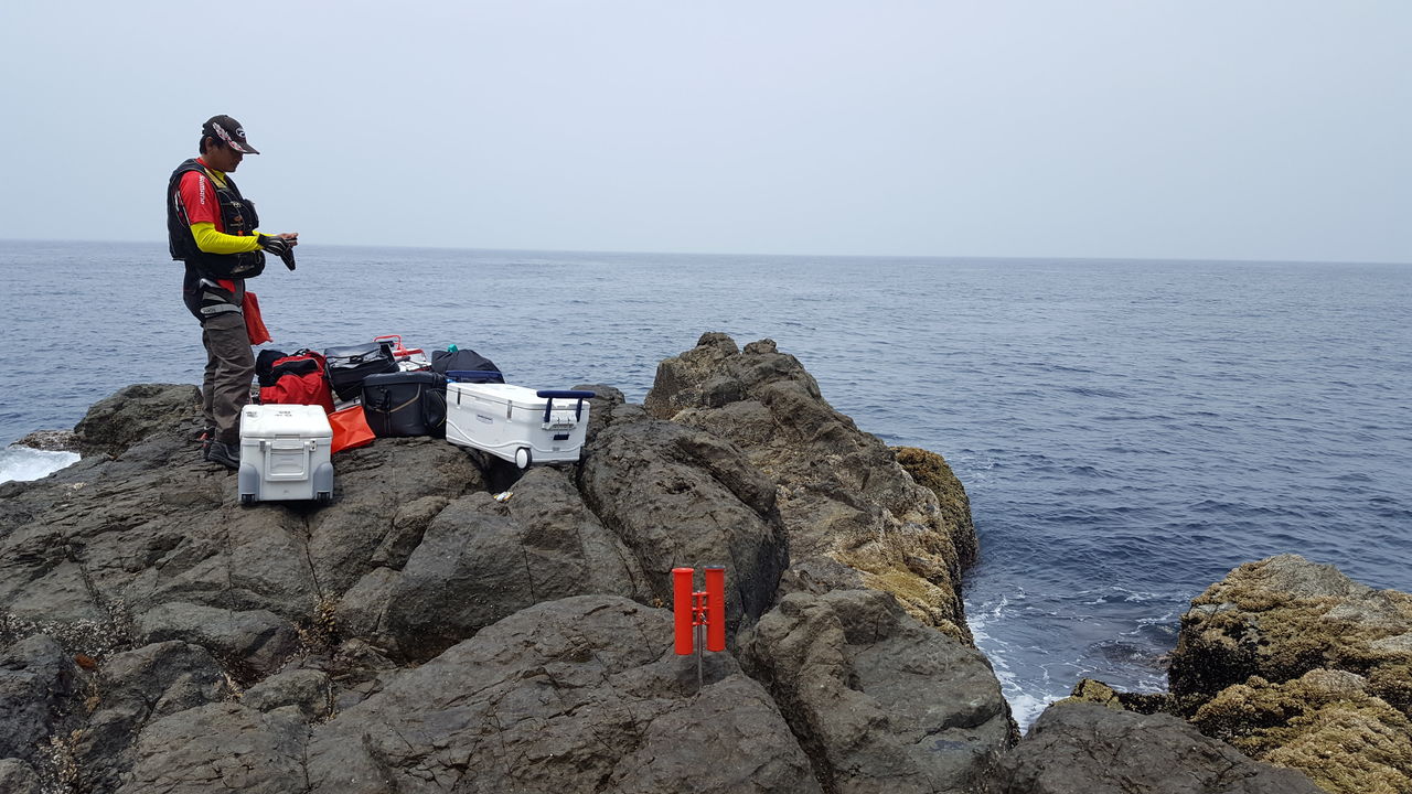 みなさん、まず磯に着いたらタモの柄を準備しましょう!いつなにが飛んでいくか、落ちて行くか分かりませんからもしもには備えましょうね