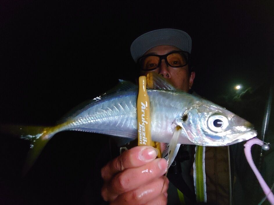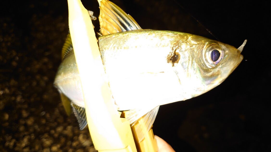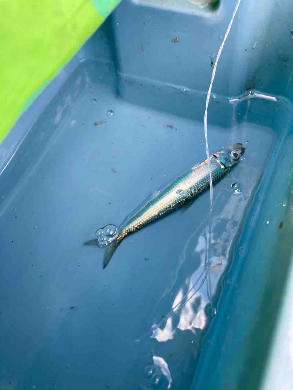 そのまま落として海底より2メーターほど巻き上げ待っていると、イワシが暴れ出しました。