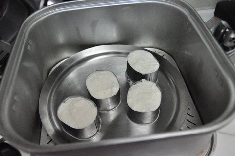 - 容器に(2)を詰めて、蒸し器で10分蒸し、粗熱が取れたらしっかり冷やす。