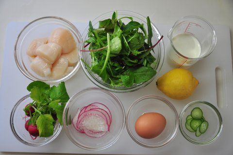 - 皿に野菜、帆立のムースを盛り付け、グレービーソースをかけて頂く。