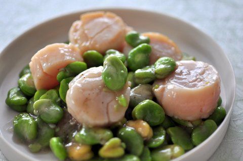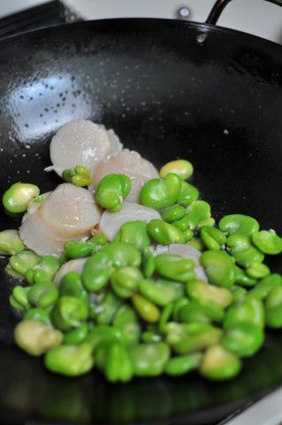 - ホタテの表面の色が白っぽく変わったら日本酒と蚕豆をくわえ、炒める。