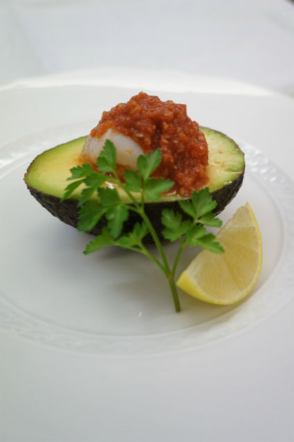 - アボガド を1/2に切り種を取り皿に置き(3)を形良く盛り付け、ソースをかけ、パセリとレモンを飾る。