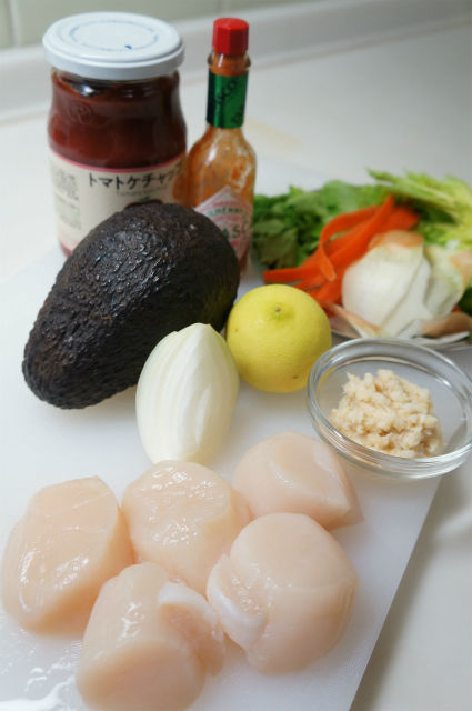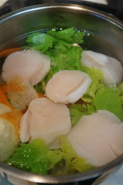 - 鍋に水とくず野菜、白ワイン、塩を入れ中火で煮立たせ香りがたったら弱火にして帆立を加え表面が白くなったら取り出す。