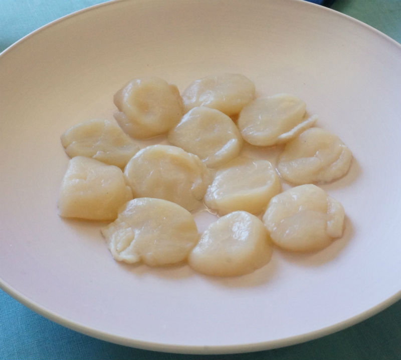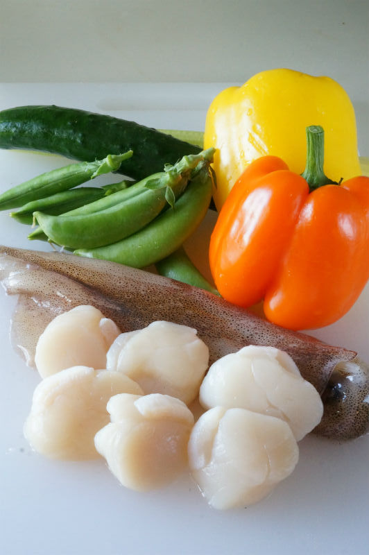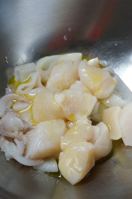 - それぞれに処理したホタテとイカはワイン少々・オリーブオイル大さじ1・塩少々で下味をつけておく。