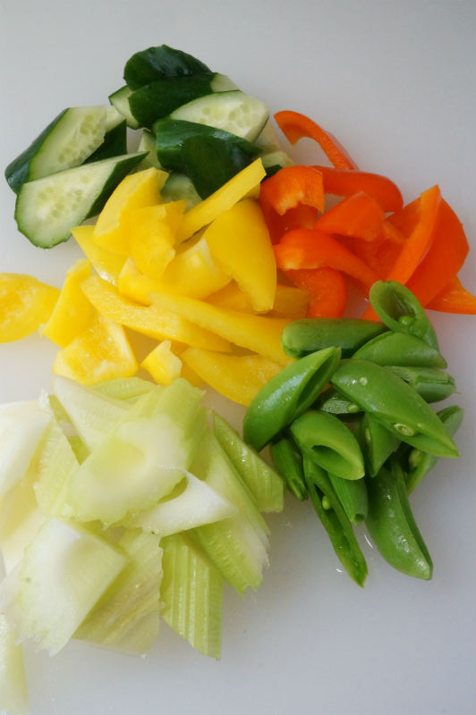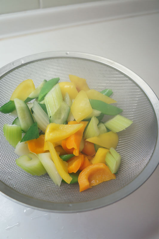- 鍋に湯をわかし、沸騰したら塩小さじ1を加えて黄・橙パプリカ、セロリ、キュウリ、スナップエンドウの順に入れさっと火を通したらざるに上げる。