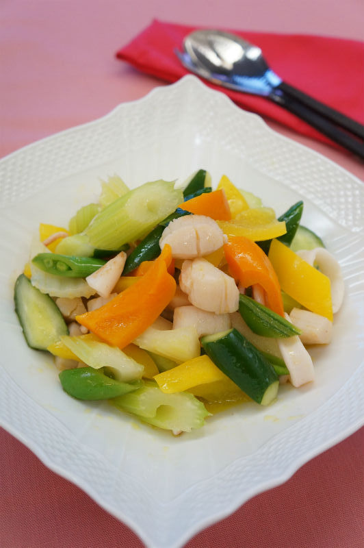 - (2)のボールに(3)の野菜・(4)のほたて、イカを入れよく和える。