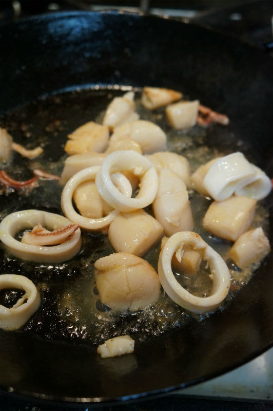- フライパンにバターをとかし、強火でホタテとイカをさっと炒める。