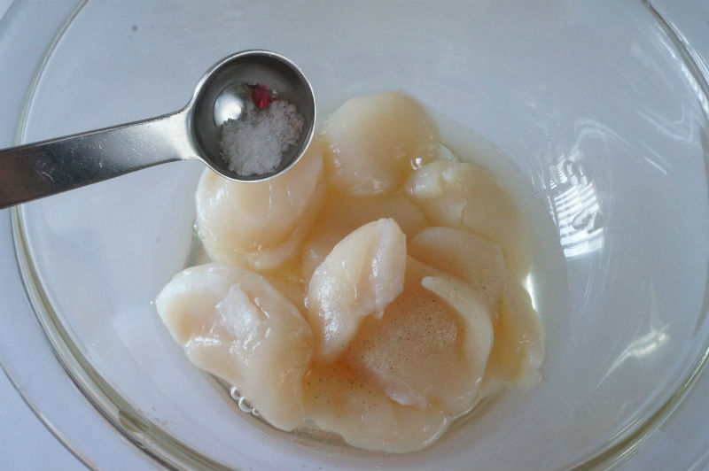 - ホタテに白ワイン少々と塩小さじ1/3を振りよく混ぜておく。