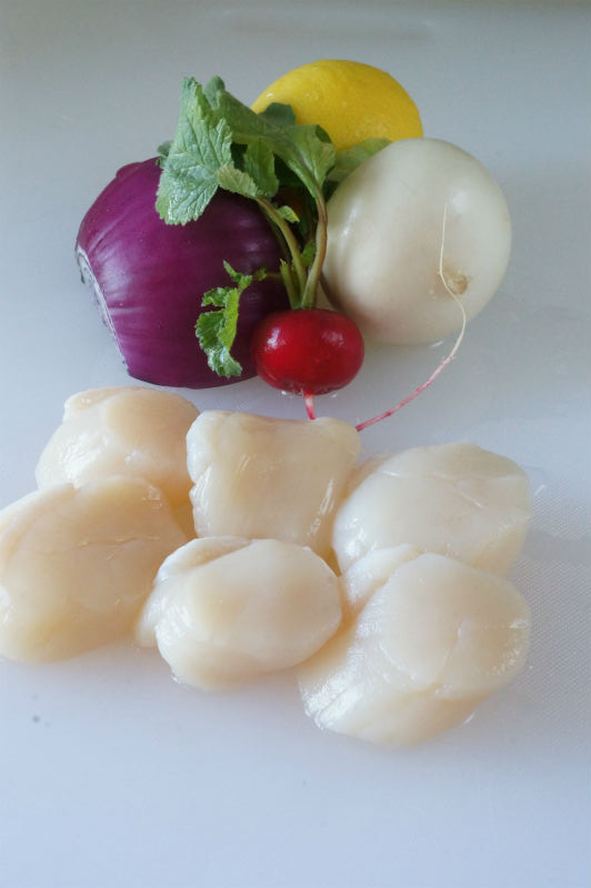 - 器に帆立を並べ、(4)をホタテを覆うようにのせ、薄く切った赤ラディッシュを中央に飾る。