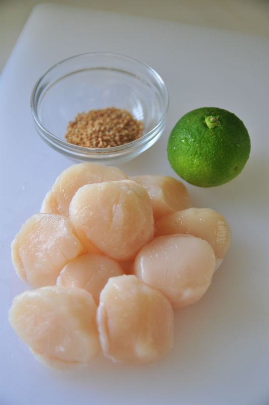 - ボールに醤油・黒酢を入れ10分ほど帆立貝柱をつける。