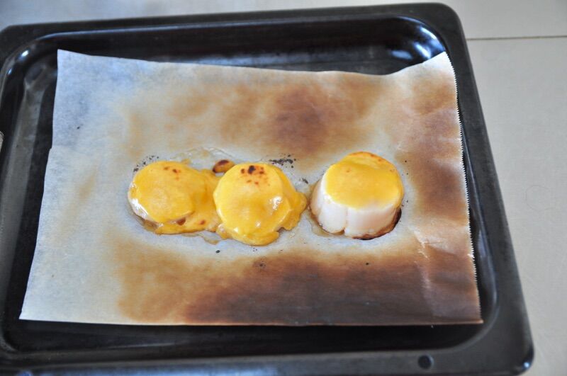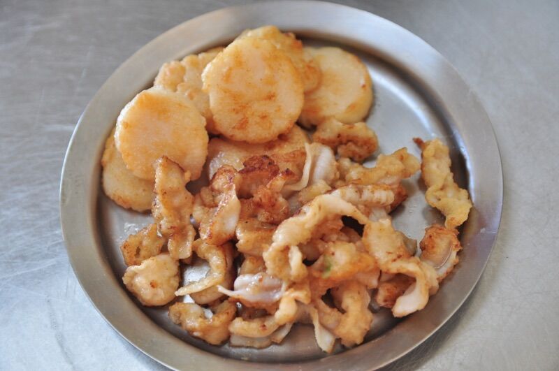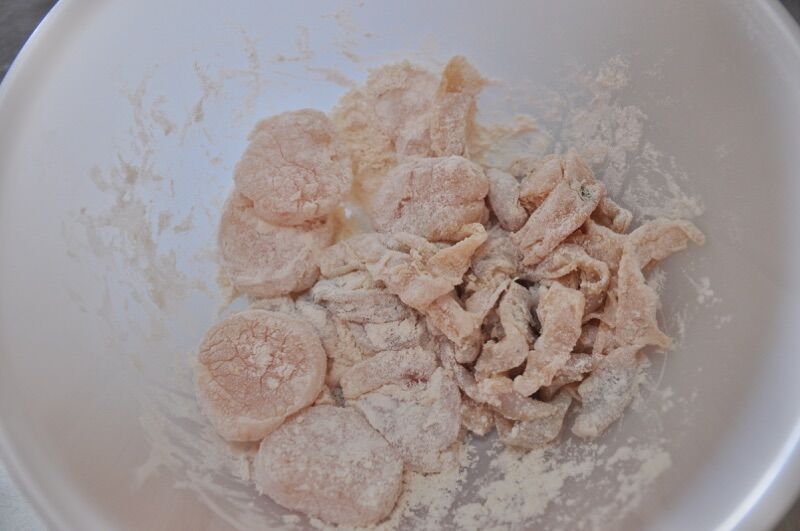 ※ホタテの水けが出ないようにとても重いバッター液になっています。少し厚めにつける感じでしっかり帆立にまとわせてください。