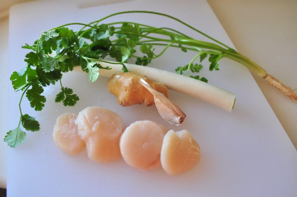 - 茹でている間に、ホタテ貝柱とひもは塩水でよく洗い水けをふき塩・胡椒する。
