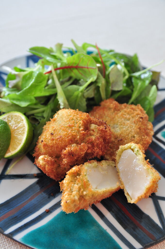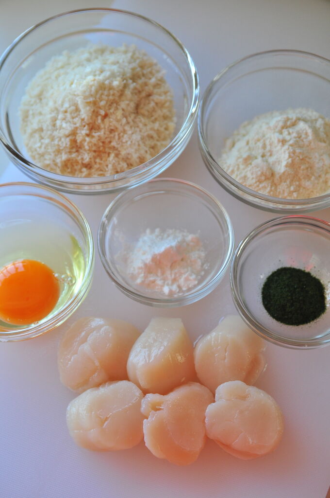 - ①のホタテに②をしっかりつけ、パン粉をまぶす。