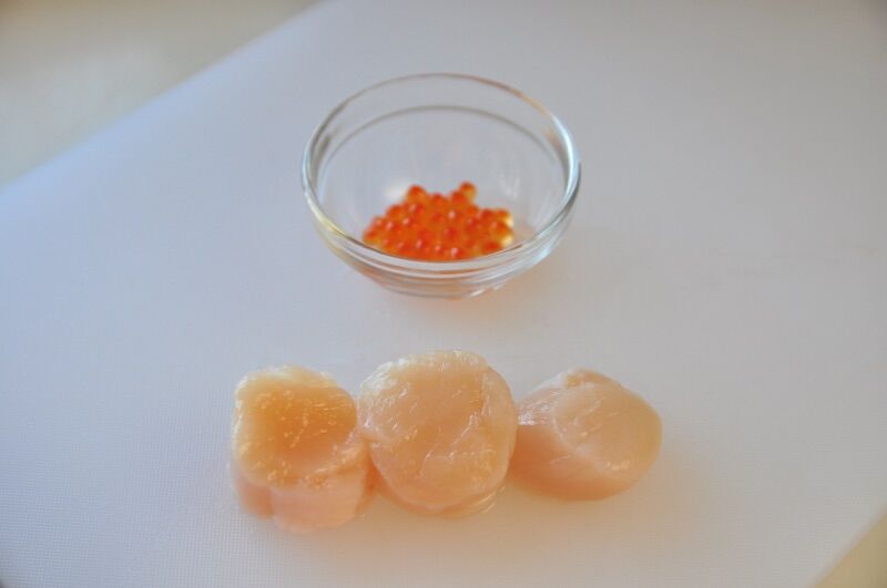 - 帆立の真ん中に切れ目を入れイクラを挟む。