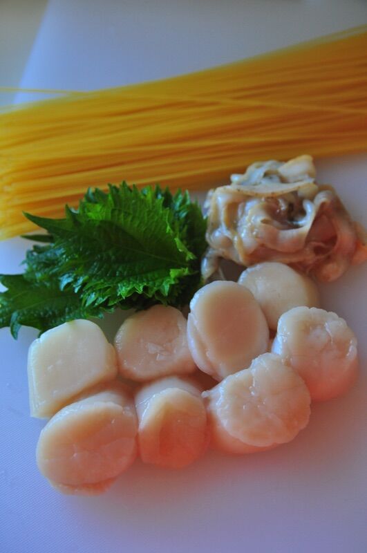 - (4)のフライパンにゆで上げたパスタを入れ旨味を絡めるように炒め、みそ・しょうゆとバターを加え更に炒めて味をなじませたら火を止め、(4)のホタテ、大葉をさっくり混ぜて盛り付ける。