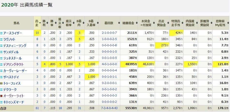欲を言えば1口のみの出資馬が増えてきたので10勝に乗せたかったですが、それは来年の目標という事で。