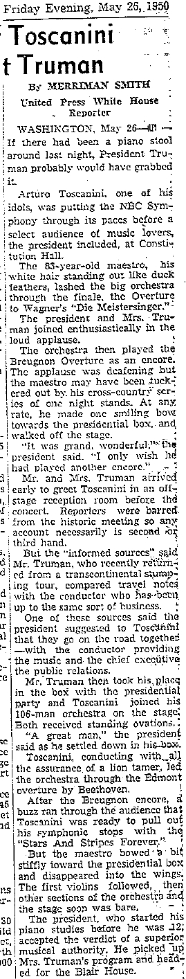 トルーマン大統領が開演前に楽屋を訪れたそうなのですが、一部の記事に「エグモント」に始まり「マイスタージンガー」で締めて、カバレフスキーがアンコールに演奏されたというものがありました。