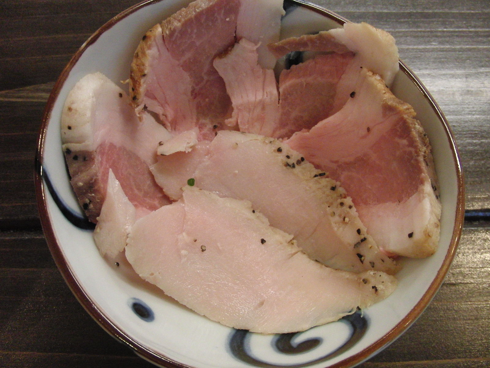 一見してわかる鶏肉と豚肉の低温調理のチャーシュー。