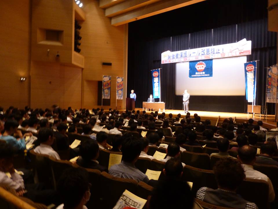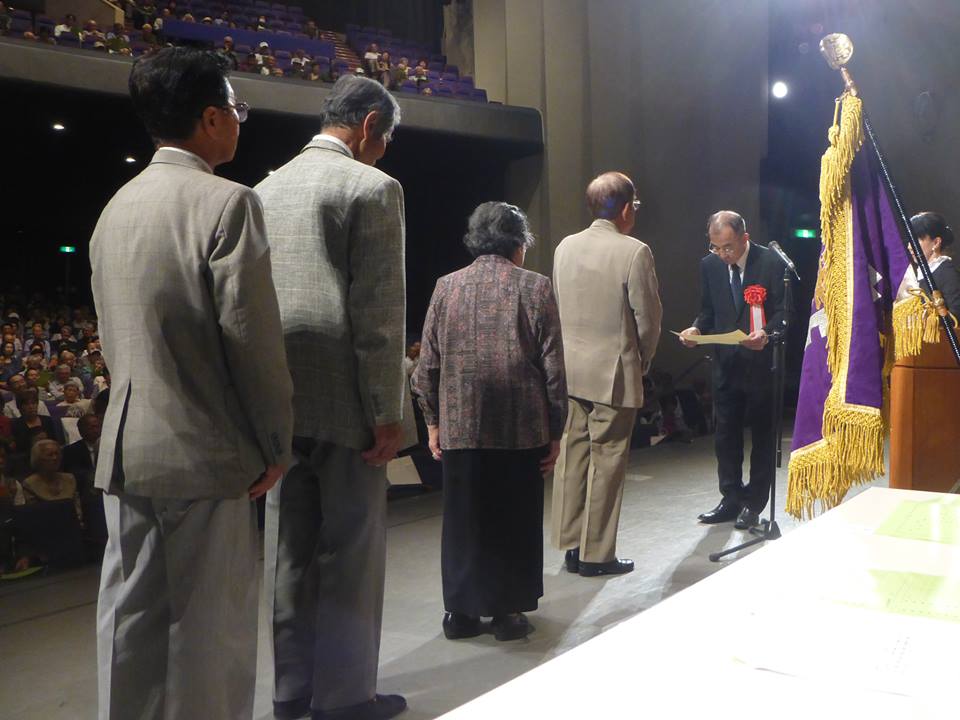 厚生委員長として壇上の来賓席から見回すと、1階席はぎっしり満員になっています。式典では、物故者への黙祷、感謝状・表彰状贈呈、大会宣言の採択などが行なわれました。