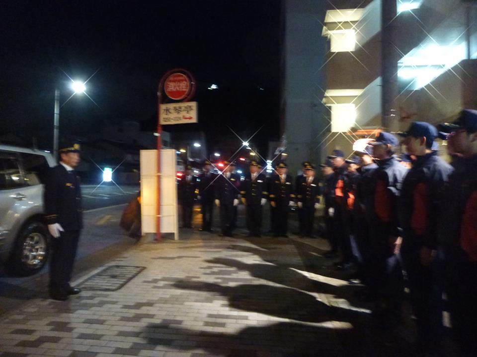 中団(15分団)は、細江市長・岐阜中警察署長・消防長・中消防団長他の巡視を受けました(金華分団を20時30分にスタート〜23時30分頃に芥見分団でゴール。※昨年とは逆回り)。
