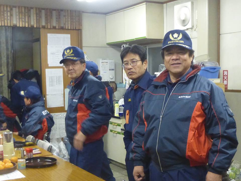 金華分団では、今年も婦人会の皆さんが大鍋で具沢山の豚汁を(昼から仕込んで)用意してくれました。巡視部隊は早めに到着され、時間調整の間を豚汁で温まっていただき、定刻どおりに訓示、スタート地点の金華を出発されました。