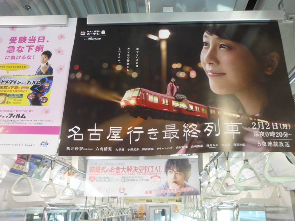 名古屋鉄道と沿線が舞台になっていて、SKE48の松井玲奈さん(鉄道マニアらしい…)や六角精児さんらが出演。駅貼りポスターや、車内の吊り広告の他、番組をPRするデザインの系統板を掲出した車両がも運行しています。