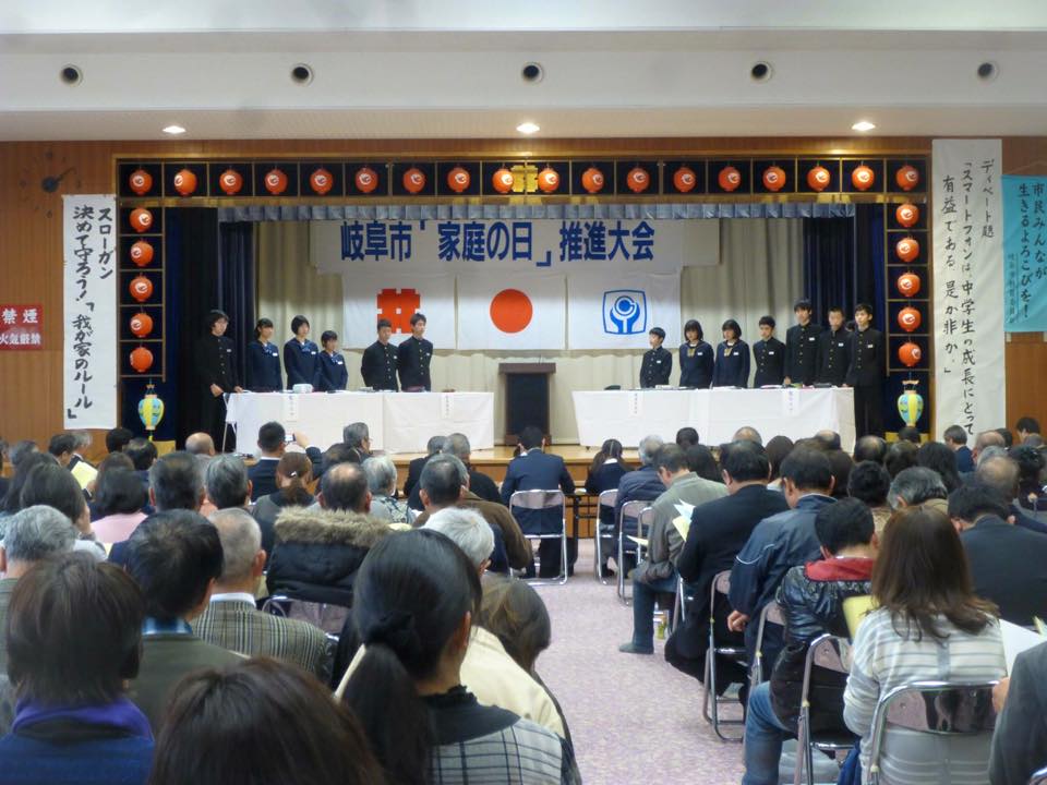 岐阜市「家庭の日」推進大会が、日光コミュニティセンターで開催されました。市教委と青少年育成市民会議の主催。私たち第3ブロックが当番なので、会場設営などもお手伝いでした。