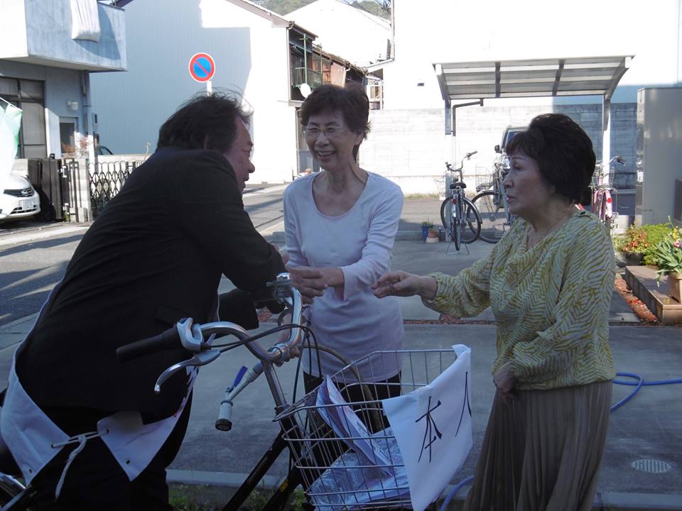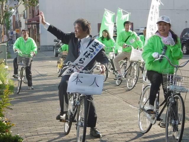 最終日に「桃太郎行進」を行なう陣営が多いのですが。歩ける距離は限られるため、全域を回り尽くせる「自転車街宣」を選びました。先導の街宣車が、自転車で来ることをアナウンスすると、大勢の皆さんに外に出て貰え、一日の新記録と思う数の握手を交わすことが出来ました。