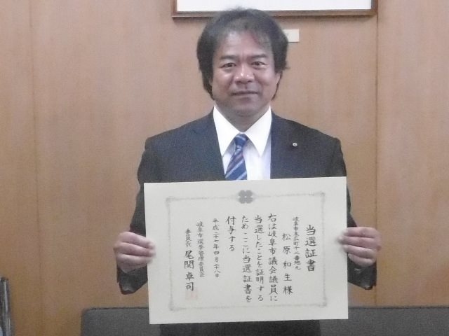 選挙管理委員長の尾関氏(濃飛倉庫運輸会長)から、得票数の多い順に、当選証書が手渡されます。1枚の紙なのですが、手に改めて市民の信託という重さを感じます。受け取る際には「頑張ります」と口にしました。