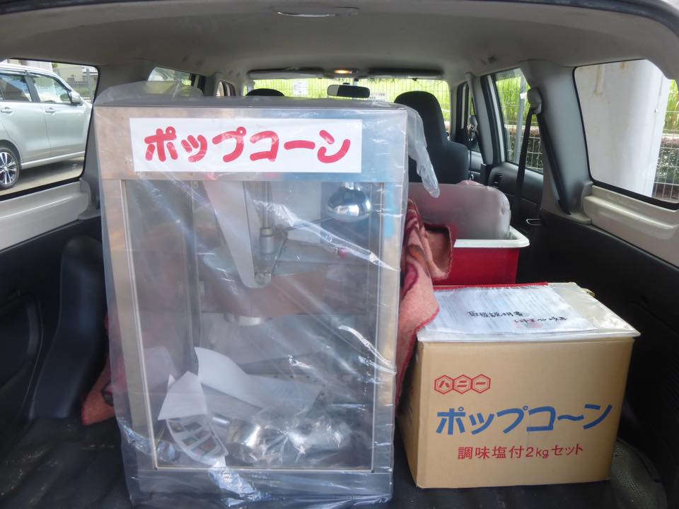伊奈波盆おどり大会のバザー用品を、予約したレンタルショップへ借りに行きました。かき氷削機(電動)2台、ポップコーン機、ラムネ・缶ジュースを冷やす水槽等を私のバンの荷台に積み込みます。