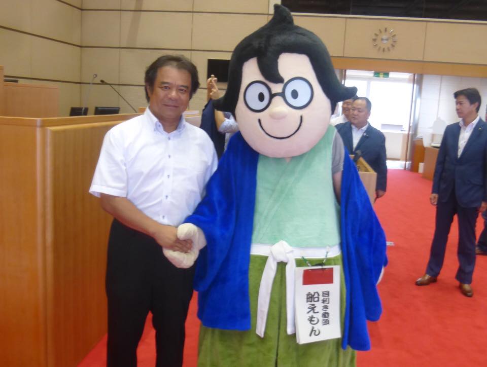 船橋市と言えば、非公式ご当地キャラ・ふなっしーが有名ですが、現地では絵柄も含めて全く見ません。代わりに会ったのが公式キャラ・船えもん(写真=議場にて撮影)。髪型が舟の字なのだそうです。実は家内の旧姓が船江なので、船えもんグッズを土産に購入しました。