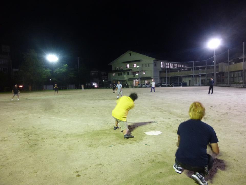 金華水防団vs金華消防団のソフトボール。4月から11月のシーズン、岐阜小運動場のナイターで、月1ペースで行います。