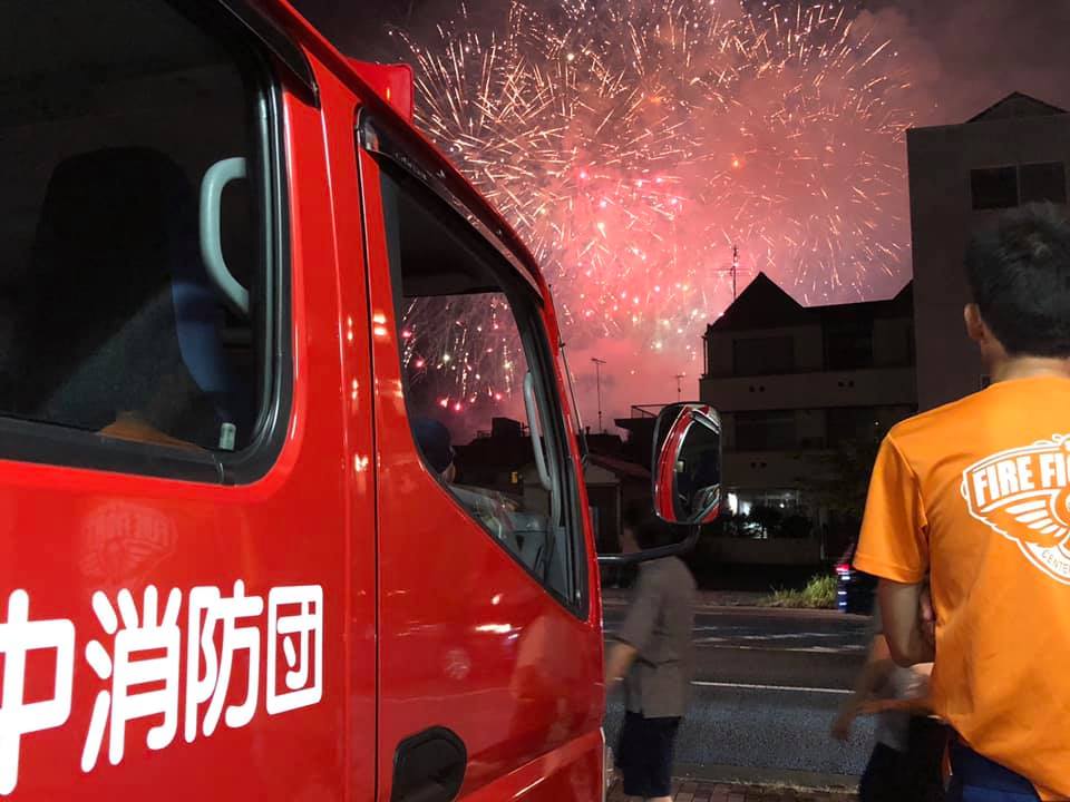 分団の前は4車線道路の為、見上げる角度に遮るものが無く、付近には座って見上げている花火客もいます。