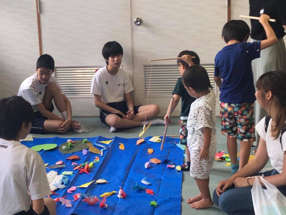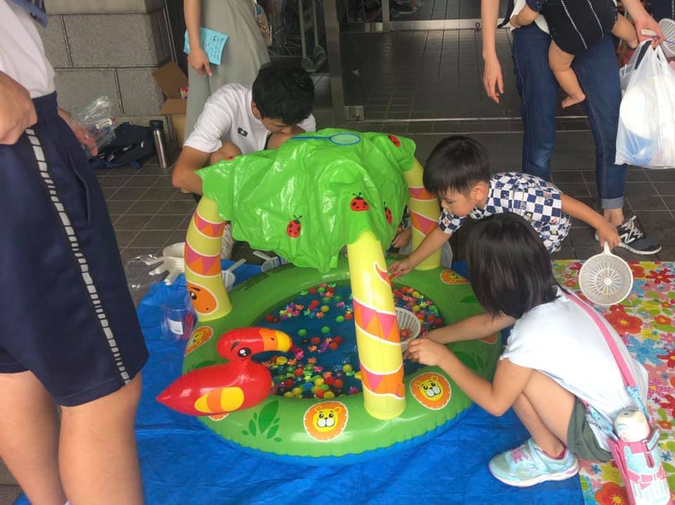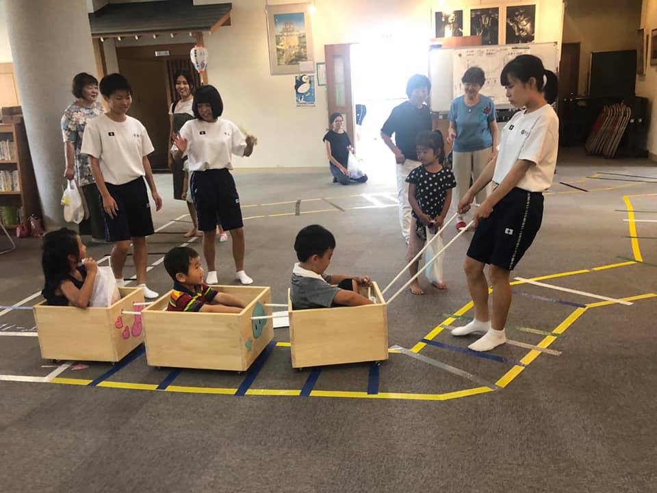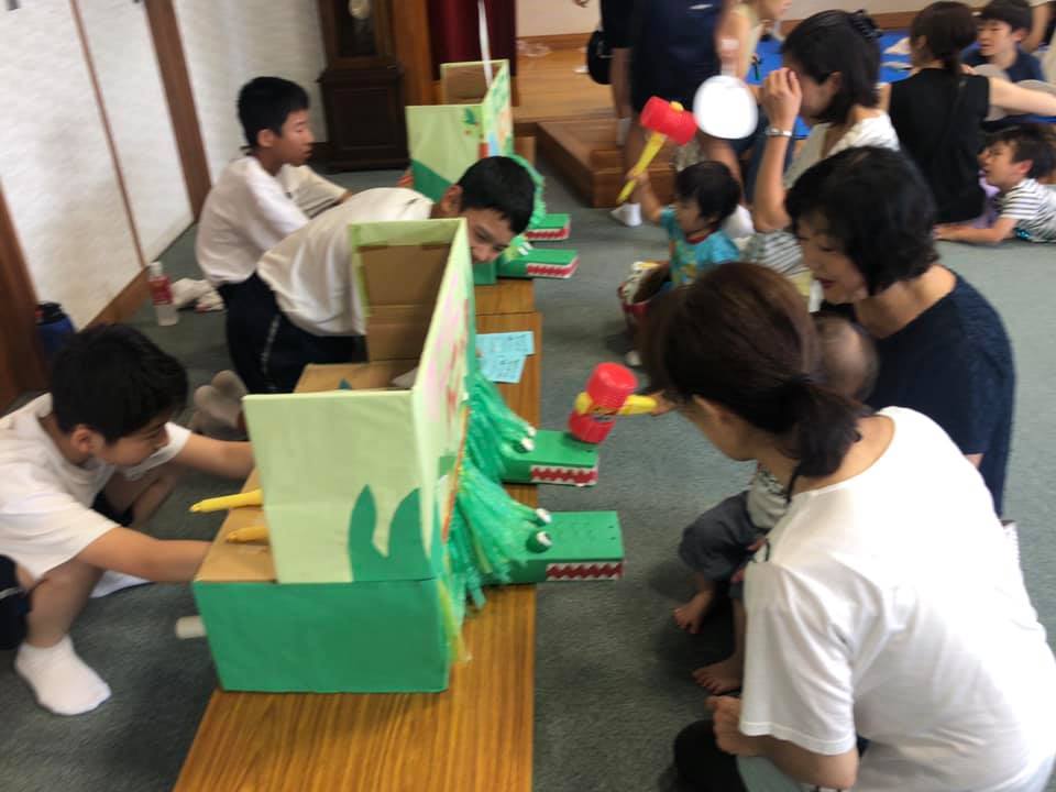 あそび広場では、お化け屋敷、輪投げなどのゲーム、大道芸遊びなど楽しい催しが一杯。お手伝いに中学生ボランティアが頑張っていました。